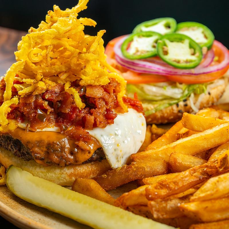 Chuck patty, fresh jalapenos, cheddar cheese, bacon relish, crispy onions, fried egg, lettuce, tomato, onion, pickle