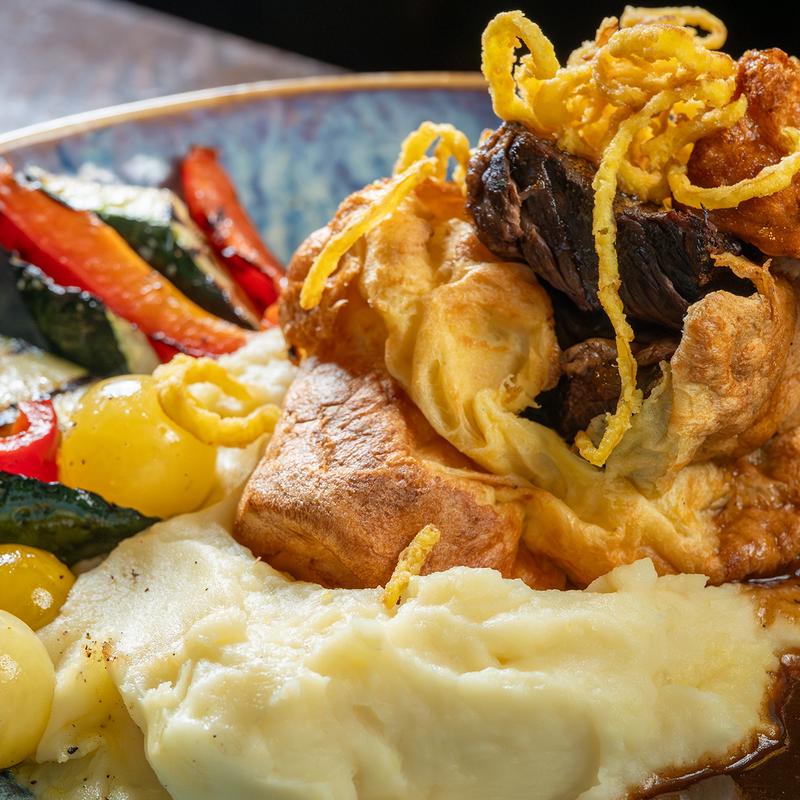 With Yorkshire pudding and pan gravy, Chef's choice of seasonal roasted root vegetables