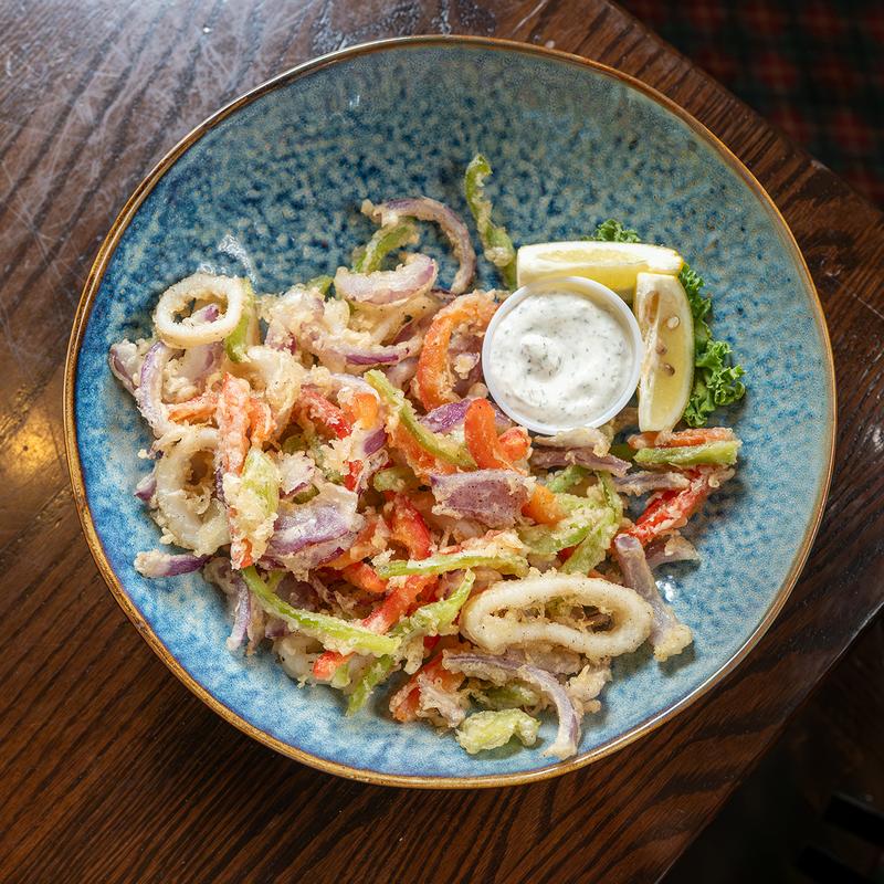 Tempura batter, bell pepper, lemon, tzatziki