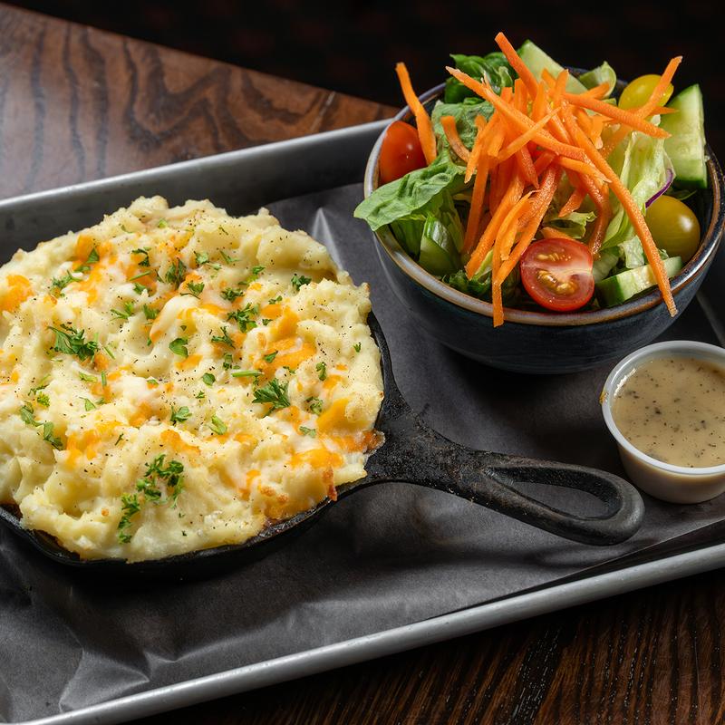 Pan-fried potato & 3 cheese pierogies, smoked Andouille sausage, sautéed onions, bell pepper, cheddar, house salad
