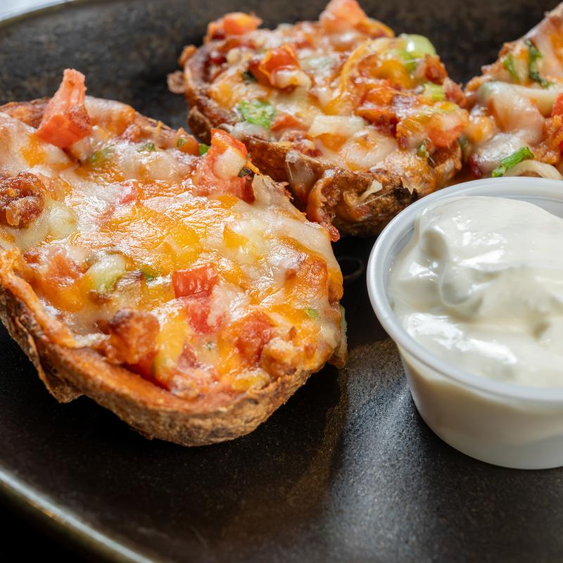Potato shells, smoked bacon, mixed cheese, tomato, scallions, and sour cream