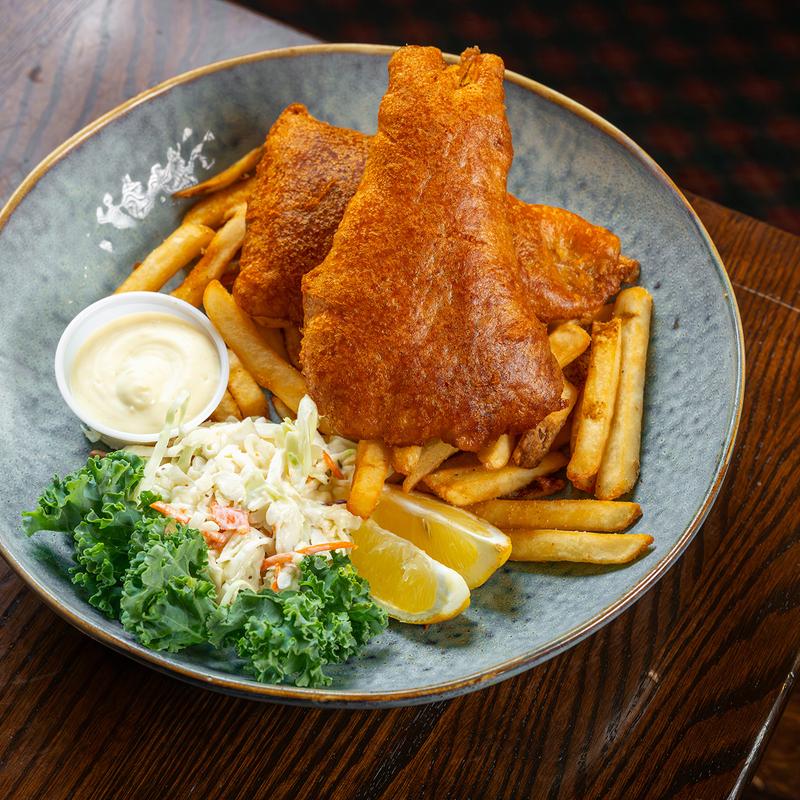 Cod filet, 2515 beer-batter, house slaw, tartar sauce, lemon.